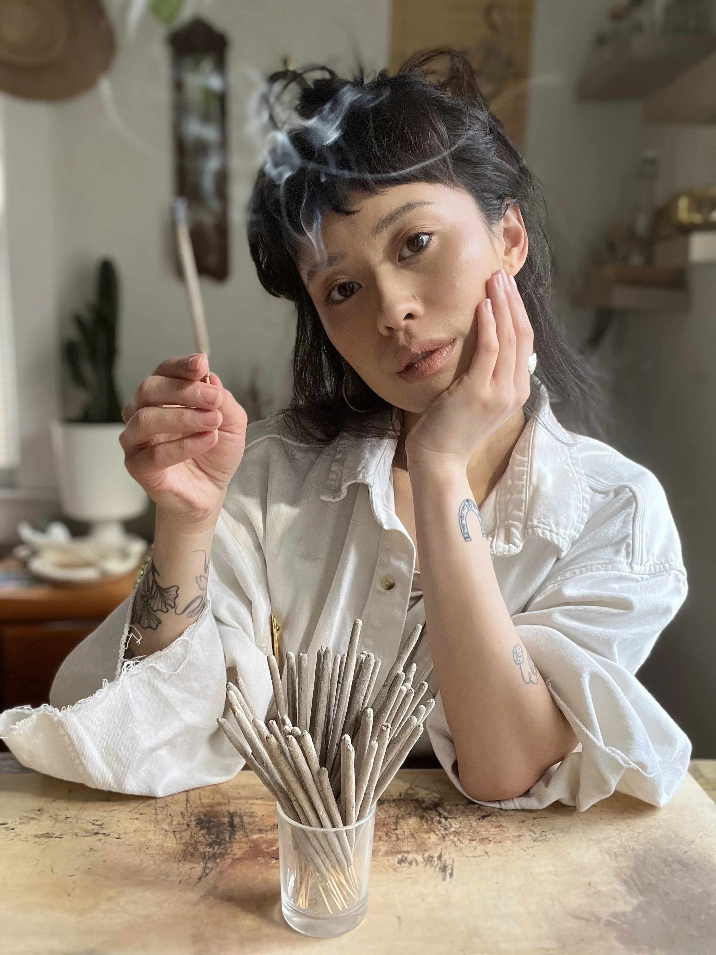I started Ancestor in 2021 as a study of scent, story, and heritage. I am Chinese, Vietnamese, and my story is distinctly American. First daughter to first gen. Born to immigrant refugees. A child of the diaspora. After the passing of my grandparents, I mourned the knowledge and stories that I will never know and burned incense everyday at my altar, finding connection in the familiar scent of sandalwood. I began to reconnect to parts of my identity I’d buried for most of my life. I began to make incense as a medium to which I could process my feelings, my work is a physical manifestation of my own rootwork. Each box of Ancestor is embellished with 葉 - the Chinese character from which my family name was derived.